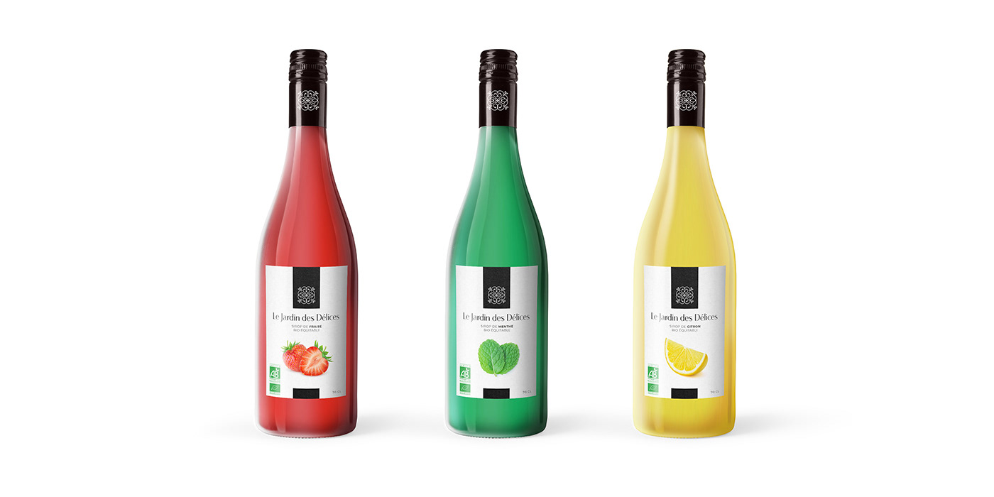 Création et réalisation de l'identité visuelle pour une marque de sirop bio équitable " Le Jardin des Délices". Conception du design des étiquettes distribuées exclusivement dans les réseaux bio.